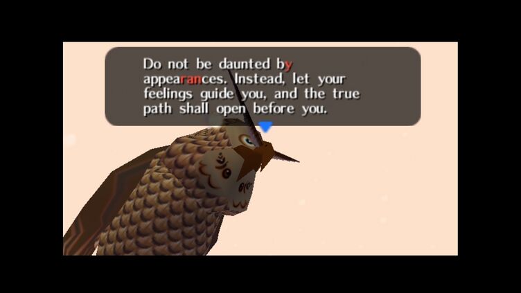 一进入冰封的冻原,就明显察觉到情况不对劲——游戏世界本身似乎正在变得不稳定。岩石、树木以及各种物体都悬浮在半空中,雪地中到处散落着奇怪的警告,劝人远离。Sarah找不到任何居民,于是前往鼓隆村,只遇到了原作游戏中的一位NPC——猫头鹰。它用隐晦的语言提到,尽管这个世界注定毁灭、正在分崩离析,但仍然可以遵循原游戏的逻辑继续推进。说完这些,Sarah获得了“真实之镜”(Lens of Truth),并开始追寻Darmani的幽灵——试图复刻原作游戏的进程。
