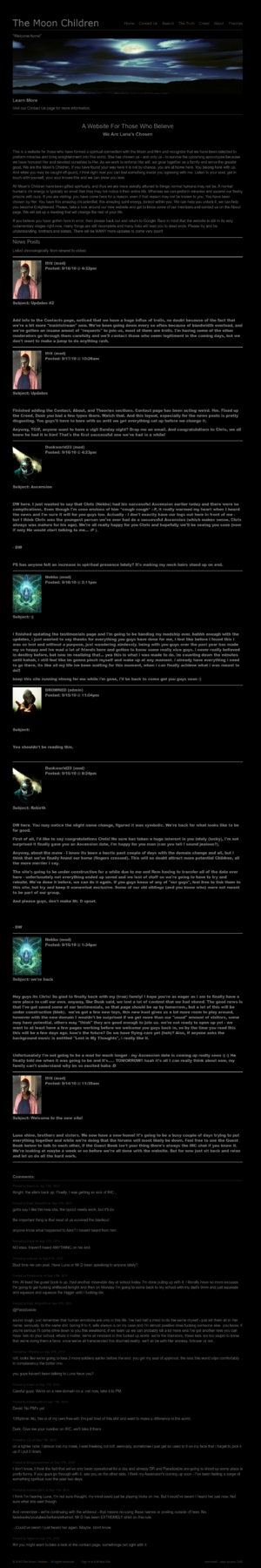 所有月之子都获得了灵性天赋,因此我们在星体层面的感知力远超普通人类。普通人的“气”(chi)能量通常微弱到终其一生都难以察觉。而我们则能凭借自身的“气”施行奇迹,并从这肉体的牢笼中升天(ascend)。如果你是来访者,那你来到这里必有原因,即使你尚未知晓这个原因。你已被她选中。你体内蕴藏着惊人的“气”潜能,这份强大的灵性能量正被封存于你之内。我们可以助你释放它,我们可以助你获得启迪(Enlightened)。请四处浏览我们这个新网站,认识一些我们的成员,并通过“关于”(About)页面联系我们。我们将为你安排一次会面,它将彻底改变你余下的人生。